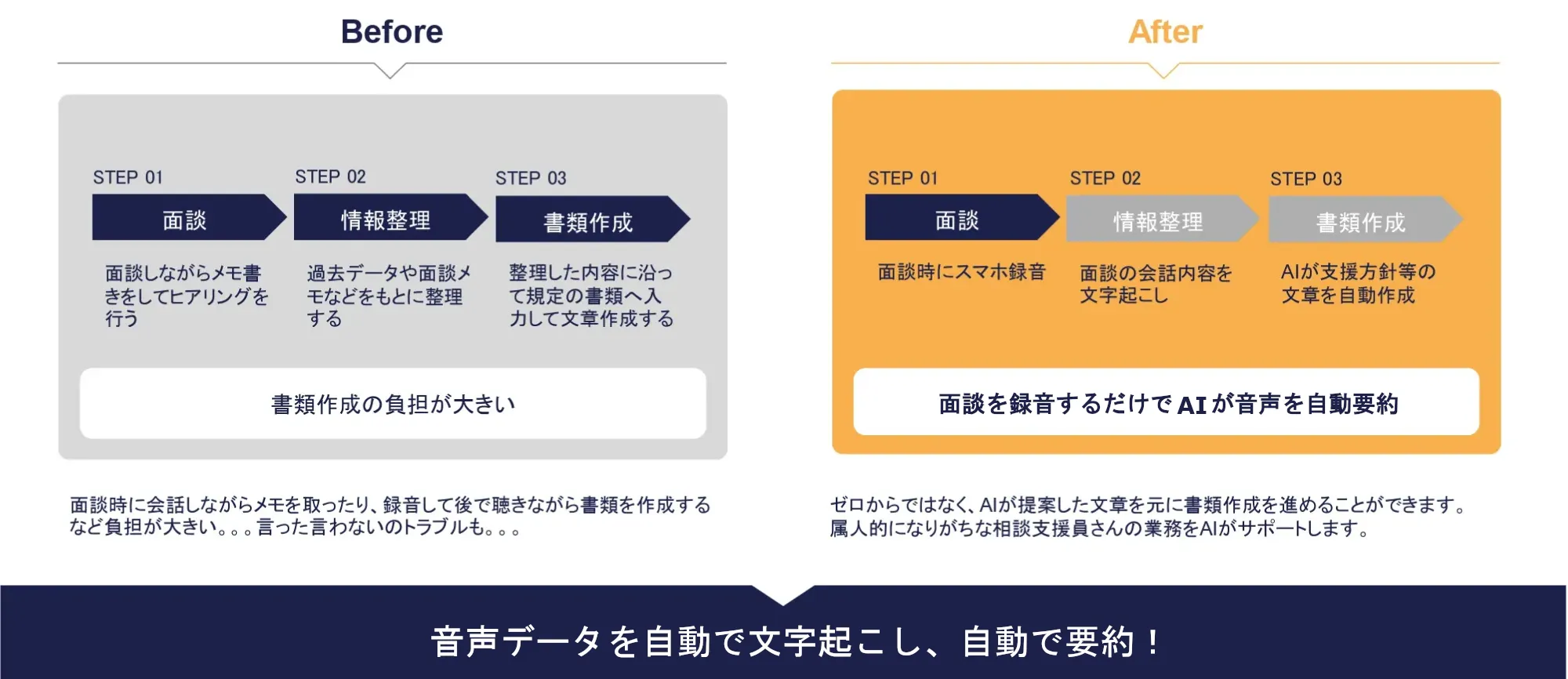 ケアラボならスマホで録音するだけで、面談の会話内容を文字起こし、自動で要約! 議事録を取る手間も、文章をまとめる手間も解消できます。