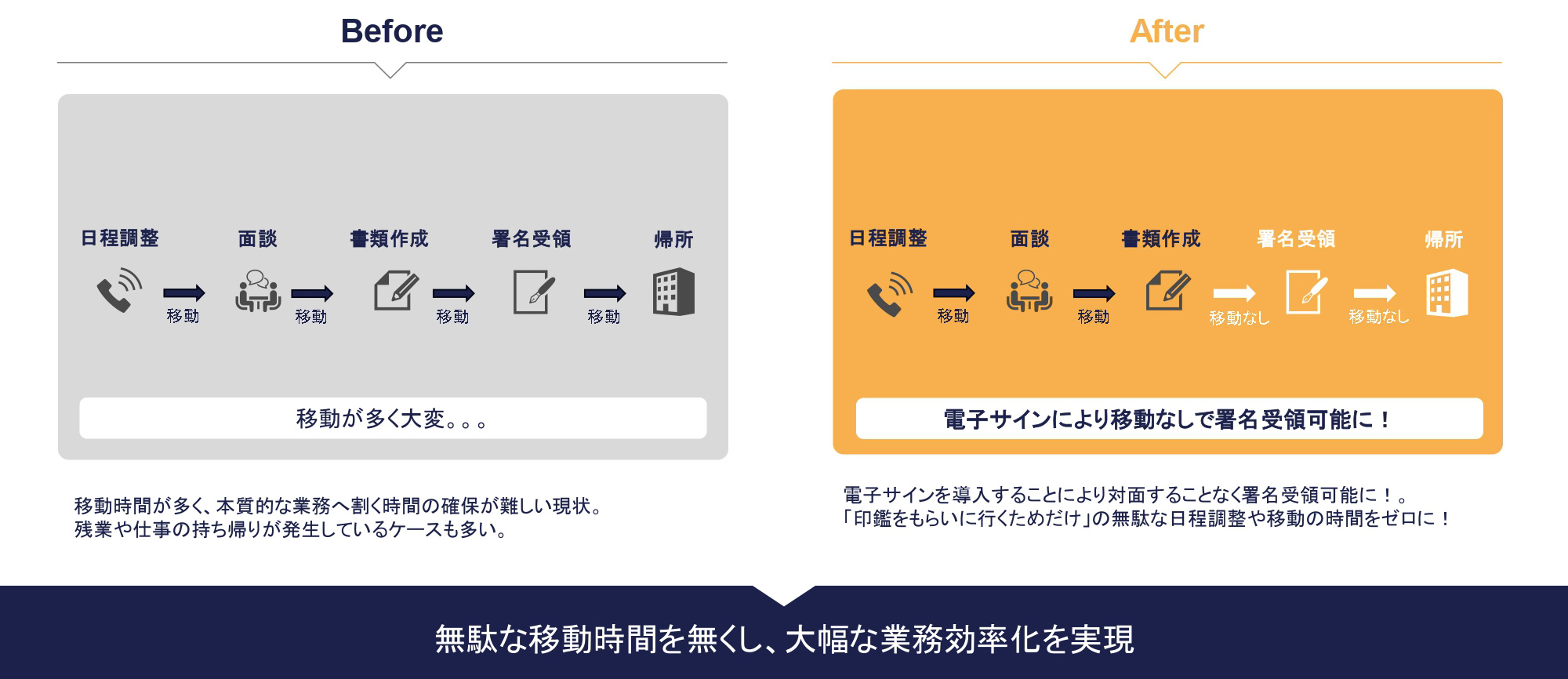 電子サインを導入することにより、紙の書面でなくオンライン上で契約が完結でき、対面することなく署名受領可能に!「印鑑をもらいに行くためだけ」の日程調整や移動の時間をゼロに!無駄な時間を無くし、大幅な業務効率化を実現します。