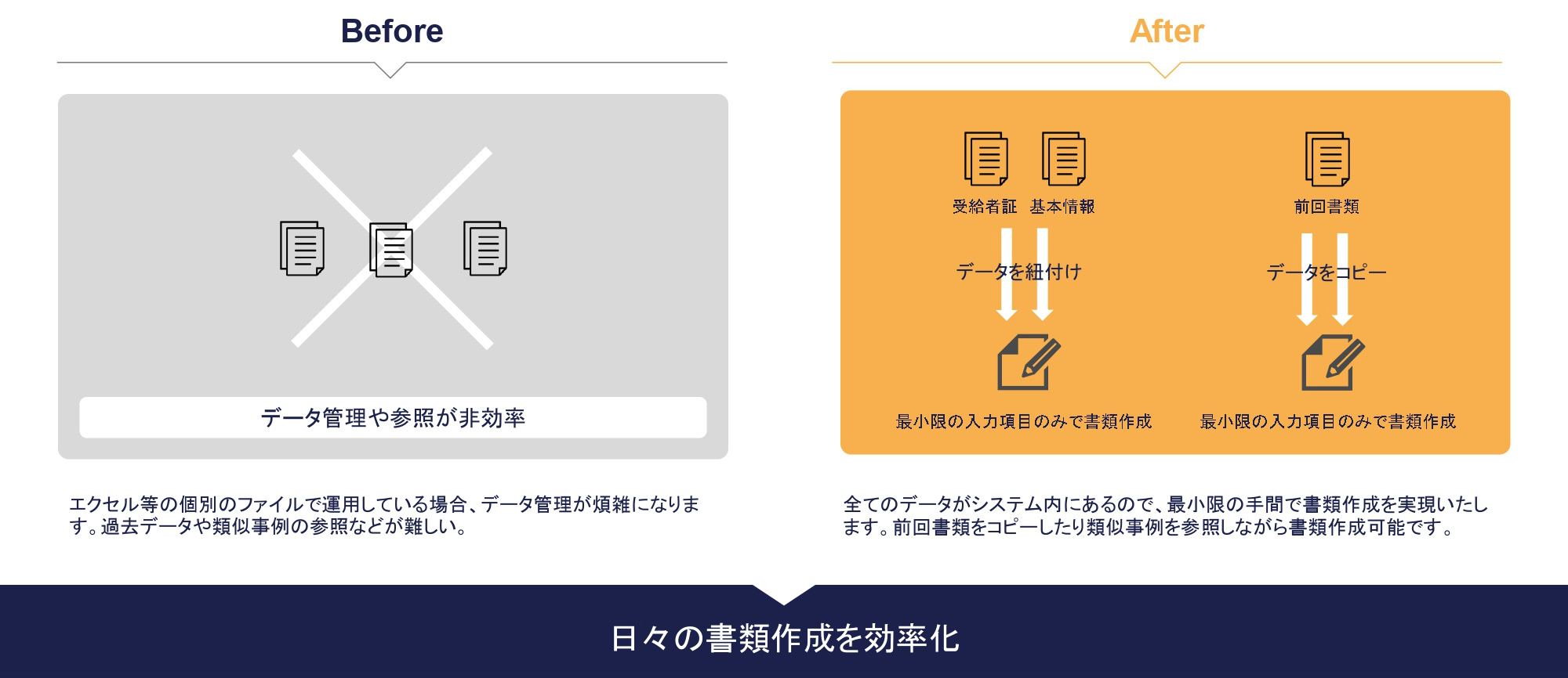 全てのデータがクラウド内にあるので、最小限の手間で書類作成を実現いたします。 前回作成した書類をコピーしたり、類似事例を参照したりできるため、書類作成の工程がスムーズになります。